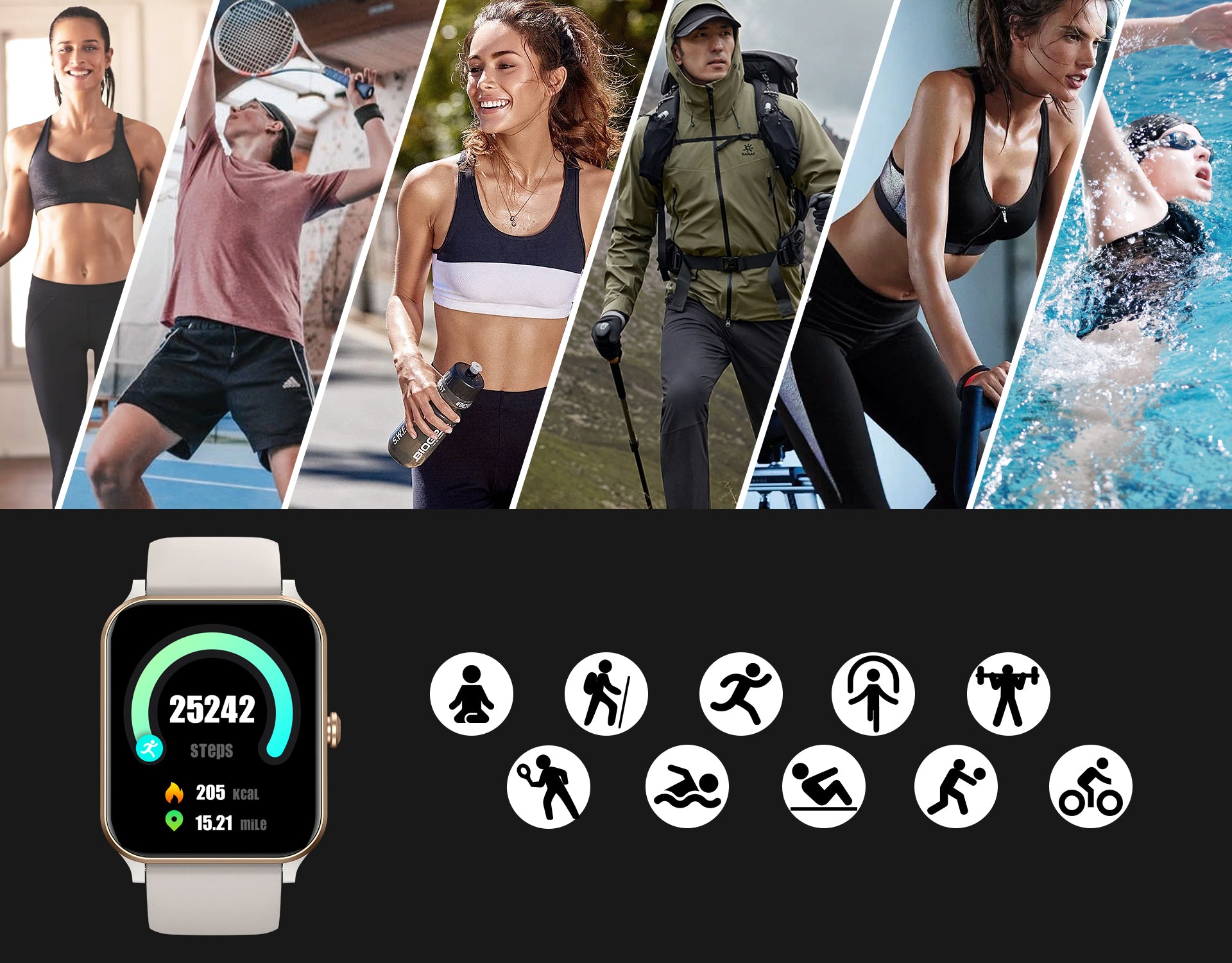 choose from 24 sports modes,including running,climbing,and cycling,to track your workout duration,calories burned,and heart rate with ease.
